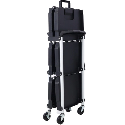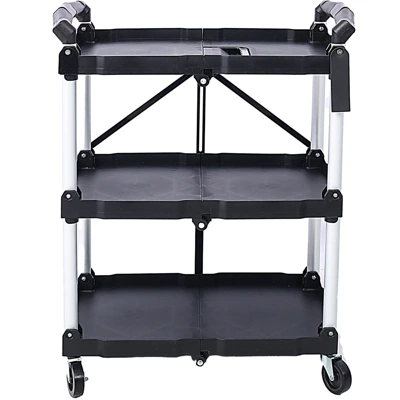 Our portable foldable cart is designed to put all your tools and equipment in one convenient place. With three foldable shelves, you will have enough space to accommodate equipment, tools, documents, garden supplies, and more. Our service vehicle has a secure locking mechanism, and with its sturdy structure and 150 pound capacity, it can handle heavy tasks and withstand the requirements of busy working environments.