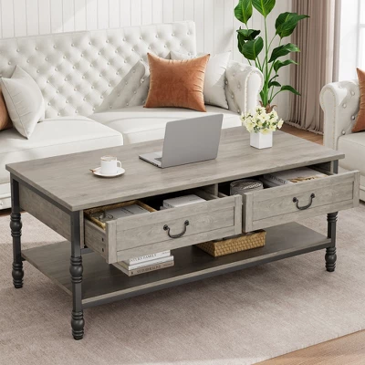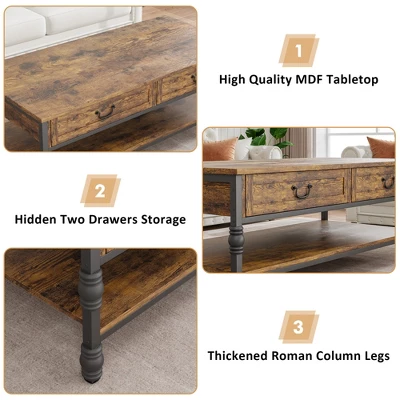 - Product Name: 41″ Rustic Coffee Table with 2 Storage Drawers, Rectangular Coffee tables w/ Storage Shelf and Metal Legs, Wood Large Coffee Table for Living Room