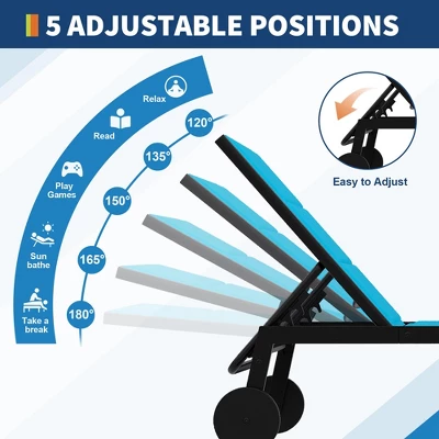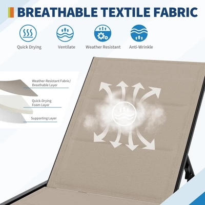 Relax in style with this outdoor lounge chair set featuring 5 adjustable positions (120¡ã-180¡ã) for ultimate comfort. Crafted with durable, weather-resistant materials, it includes a breathable textile fabric for quick drying and anti-wrinkle properties. The set comes with a sturdy, easy-to-clean side table and convenient wheels for easy movement. Perfect for poolside or patio use. Net weight 21.8 lbs, table weight 352 lbs.
