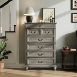 Farmhouse Tall Dresser For Bedroom With 7 Drawers, 50″ Tall Large Wood Chest Of Drawers