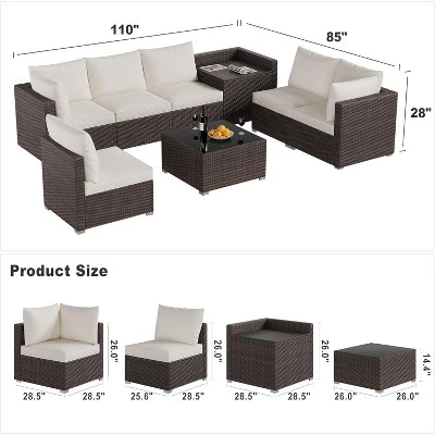 ¡¾Weather-Resistant and Durable Outdoor Furniture¡¿ Premium PE Rattan Woven Design: Crafted with high-quality, UV-resistant PE rattan, this set is designed to withstand sun, rain, and wind without fading, cracking, or peeling. Perfect for year-round outdoor use. ¡¾Unmatched Comfort for Relaxation¡¿Plush 3-Inch Thick Cushions: Sink into the ultra-soft, high-density foam cushions that offer superior comfort for hours of lounging. ¡¾Customizable Layout for Any Space¡¿ Modular Sectional Design: Arrange the sofas and chairs to fit your unique outdoor space, whether it¡¯s a cozy balcony, sprawling lawn, or poolside retreat. ¡¾Effortless Cleaning and Maintenance¡¿Removable & Washable Cushion Covers: The zippered cushion covers are easy to remove and machine-washable, ensuring your furniture always looks fresh and clean. ¡¾Complete 5-Piece Set for Outdoor Living¡¿Everything You Need in One Package: 1 x 3-seater sofa (67.7″ x 31.5″ x 26.8″), 1 x loveseat (48″ x 26.8″ x 31.5″), 2 x armchairs (28.4″ x 26.8″ x 31.5″), 1 x coffee table (34.3″ x 19.7″ x 13.8″).