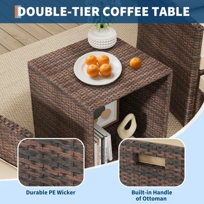 - 【Upgraded Functional Coffee Table】 The rattan coffee table offers a safe, sturdy surface for drinks, meals, or decorative items. Its unique box design maximizes storage space, perfect for blankets, books, or other outdoor essentials. This patio furniture set with ottomans combines style and practicality, making every outdoor gathering more enjoyable.