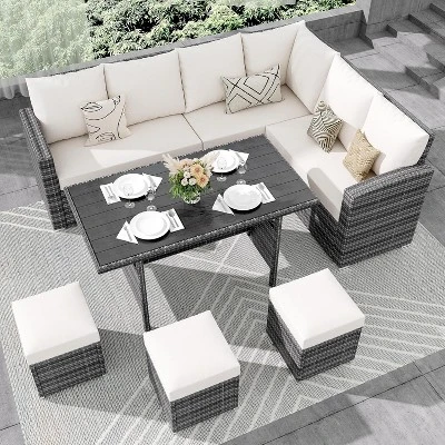 Durable and Comfortable Construction – Made with high-quality iron frames wrapped in PE rattan, the durable design can withstand harsh weather conditions. The outdoor furniture comes with soft seat cushions and high-density foam padding, providing a super comfortable living experience for your family and guests. Moreover, the cushion covers feature smooth zippers for easy removal and cleaning. Elegant Outdoor Dining Set – The terrace dining set can add a charming touch to your terrace, porch, backyard, poolside, or lawn garden – creating an elegant leisure area for outdoor relaxation such as family gatherings or parties. This outdoor furniture set is lightweight, easy to move, and perfect for various environments. Natural and Stylish Design – The unique wood grain tabletop adds a natural and retro style to your garden. The upgraded wood-plastic composite tabletop is 54 inches long and 29 inches wide, providing ample space for gatherings or dining. The tabletop can withstand temperatures around 60-80¡ãC, but it is not recommended to place hot items directly on the table. Additionally, the bottom area of the large table can store 3 stools and 3 cushions, offering a perfect storage solution. Flexible and Spacious – This outdoor modular furniture set can be easily rearranged into different layouts and is detachable, providing enough space for family or friend gatherings. The patio table can accommodate up to 5-8 people dining together, enjoying leisure time. The single seat has a weight capacity of 250 pounds, while the corner seat can hold up to 500 pounds. Convenient Assembly and Customer Support – This 7-piece patio furniture set comes in 3 boxes with clear instructions, including 3 footstools, 3 corner combination sofas, and 1 courtyard dining table, making assembly convenient.