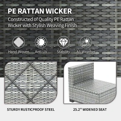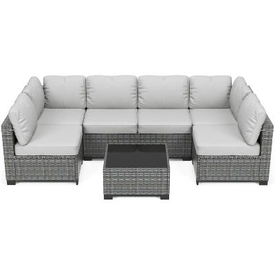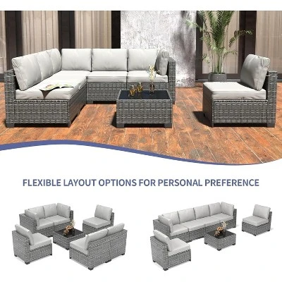 Upgrade your outdoor living space with this versatile and durable 7-Piece Wicker Patio Furniture Set. Constructed with a rust-resistant powder-coated steel frame and wrapped in tightly woven all-weather PE wicker, the set delivers both strength and style. The textured arcuate stripe weave adds depth and elegance, while the thick cushions offer unmatched comfort. Featuring removable, waterproof covers and anti-slip cushion bases, maintenance is a breeze. Each modular piece can be used individually or rearranged to suit your layout¡ªideal for patios, gardens, decks, or poolside relaxation.