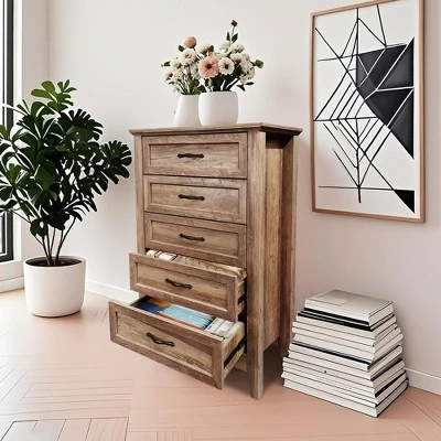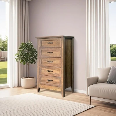 Add vintage charm and functional storage to your home with this Garvee 5-drawer dresser. Crafted from durable engineered wood, it features a classic framed drawer front, stylish handles, and a smooth, waterproof finish that blends easily into various decor styles. Its tall vertical design saves floor space while keeping your room tidy and organized. This piece offers the perfect balance of elegance and practicality, ideal for bedrooms, closets, entryways, or nurseries.