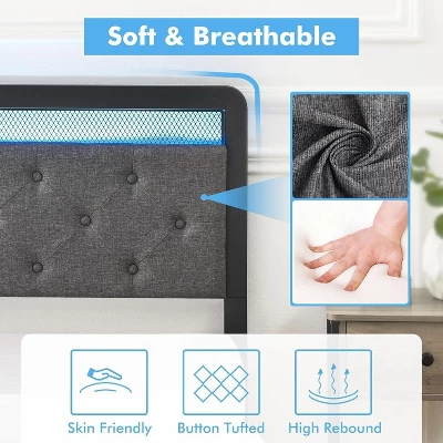 Large Storage Space for OrganizationSay goodbye to clutter with our platform bed frame, featuring 2 spacious storage drawers conveniently located underneath the bed. Each drawer is equipped with 4 smooth-gliding wheels, making it easy to access your stored items. Perfect for organizing bedsheets, off-season clothing, bedding, toys, and more, this bed frame maximizes your bedroom space while keeping everything within reach.A Bed That Combines Comfort and StyleDesigned to elevate your bedroom decor, this bed frame boasts a linen-inspired smoke gray fabric finish and a button-tufted headboard for a modern, elegant look. The high-density foam padding, wrapped in breathable linen fabric, offers soft yet durable support, making it ideal for reading or watching TV in bed. Compatible with mattresses ranging from 9″ to 12″, this bed frame is as practical as it is stylish.Smart LED Bed Frame for a Dynamic AmbianceTransform your bedroom into a relaxing retreat with the built-in RGB LED light strip. Featuring 12 scene modes, 7 static colors, and 3 brightness levels, the LED lights create a variety of stunning lighting effects that can be controlled via the included remote or app. For added fun, the lights sync with the rhythm of your music, adding a dynamic and playful touch to your space.Stable and Durable Construction for Peace of MindBuilt to last, this queen-size storage bed features a sturdy metal frame with 13 heavy-duty metal slats and 9 support legs, ensuring exceptional stability and durability. With a weight capacity of 1100 lbs, it’s designed to handle everyday use with ease. The EVA sound-absorbing strip along the center bar minimizes noise from metal-on-metal contact, ensuring a quiet and restful sleep.Easy Assembly for Quick SetupSetting up your new bed frame is a breeze, thanks to the detailed instructions, labeled parts, and included tools. Most users can complete assembly in just 35 minutes by following the simple tip: avoid tightening screws until all parts are in place, then secure everything for a perfect fit.Why Choose This Platform Bed Frame?✔️ Ample Storage – 2 spacious drawers with smooth-gliding wheels for easy access.✔️ Stylish and Comfortable – Linen-inspired fabric, tufted headboard, and high-density foam padding.✔️ Smart LED Lighting – Customizable RGB lights with sound sync for a dynamic ambiance.✔️ Heavy-Duty Construction – Sturdy metal frame, 13 slats, and 9 legs for maximum stability.✔️ Quick and Easy Assembly – Clear instructions and labeled parts for hassle-free setup.Upgrade your bedroom with this multifunctional platform bed frame—a perfect blend of storage, style, and smart features that will transform your sleep and living experience! ?