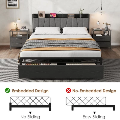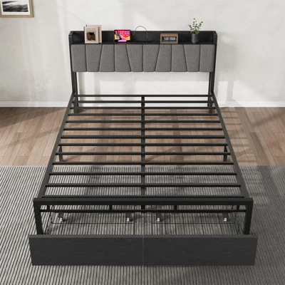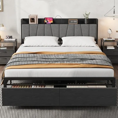 Queen Size Bed Frame with Upholstered Headboard, Industrial Queen Platform Bed with 2 Storage Drawer and Charging Station No Box Spring Needed