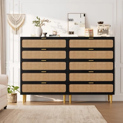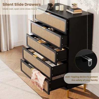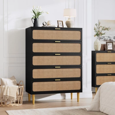 This 5-drawer rattan dresser by Garvee combines natural craftsmanship with practical design. Hand-woven rattan panels highlight the rustic charm, while deep drawers and a wide top provide ample space to store daily essentials. Reinforced with sturdy metal legs and support bars, it ensures lasting durability for any room.