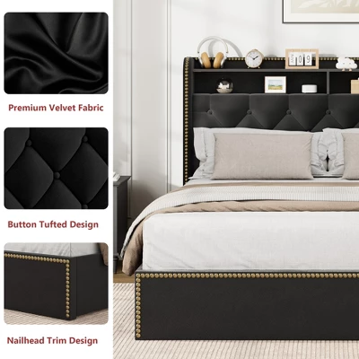 Upholstered Queen Size Bed Frame with 4 Drawers, Black Velvet Queen Platform with Tufted Headboard and Nailhead Design, No Box Spring Needed