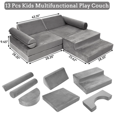 DIY Assemble – Our play couch come with 13 memory foam of different shapes not only boost children’s imagination, but also meet your DIY crawling route design, freely assemble as couchs, effectively exercise your child’s crawling ability and thinking ability, and let you enjoy a happy time with kids. The set of modules can be used for playing, as well as for exercises, to create obstacle courses or spatial constructions.Soft & Durable: Play couch’s foam core stands up to years of play. The Kids couch provides a soft and low-impact surface for kids to jump, rest, and fall on with no hard edges or sharp corners. Kids can easily crawl and explore on the modular sofa. The baby climbing toys are also effective in preventing your baby from slipping or injuring herself. Suitable for kids to play, climb, chat, relax or watch TV.