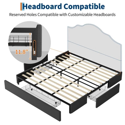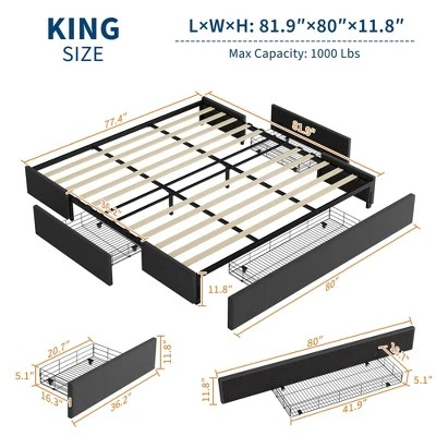 King Bed Frame with 3 Storage Drawers, Fabric Upholstered Platform Bed, Wooden Slats Support, Dark Grey