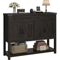 Sideboard Buffet, Wood Floor Cabinet With Carved Flower Door, Metal Handle, Freestanding Sideboard
