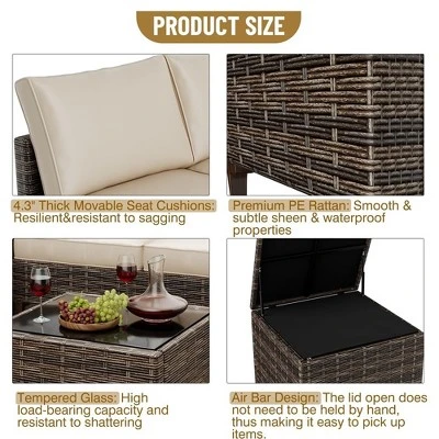 Outdoor PE Wicker Furniture Set 4 Piece, Patio Rattan Sectional Patio Couch Set, Conversation Sofa with Storage Box, Glass Top Table & Non-Slip Beige Cushion