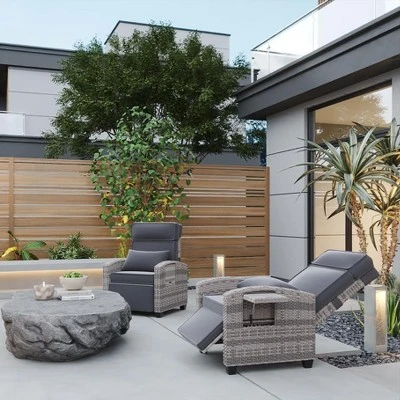 Enjoy unparalleled comfort with an adjustable footrest that allows you to kick back and relax. Perfect for sunbathing or simply enjoying a good book! Experience relaxation with the ability to recline up to 150¡ã. Whether you want to take a nap or soak up the sun, this chair has you covered. Stay organized and keep your essentials close at hand with the convenient flip-up table. Perfect for holding drinks, snacks, or your favorite book while you unwind. Crafted from high-quality rattan, these chairs are built to withstand the elements while providing a stylish touch to your outdoor decor. Easily adjust the chair¡¯s position with the included air pump, making it simple to find your perfect lounging angle. The chic light-grey color complements any outdoor setting, adding a modern touch to your patio or garden. Our chairs are designed to provide maximum comfort without compromising on style. Ideal for various outdoor activities, from relaxing by the pool to enjoying a cozy evening by the fire. The rattan material is easy to clean and maintain, ensuring your chairs look great season after season. Transform your outdoor space into a sanctuary of relaxation with the Outdoor Reclining Chairs. Perfect for lazy afternoons or entertaining guests, these chairs are a must-have for anyone who values comfort and style.