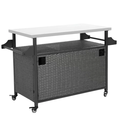 DescriptionProduct Name:Kitchen Wicker Island Rolling CartColor: GreyProduct Dimensions: 51.18” W x 21.65” D x 34.25” HSpecial Feature: WheelRecommended Uses For Product :outdoor and indoor area including garden, yard, pool, kitchen, dining roomFrame Material: SteelMaximum Weight Recommendation: 154 PoundsCarton size: 45.28” W x 31.5” D x 8.66” HItem Weight: 70.55 Pounds