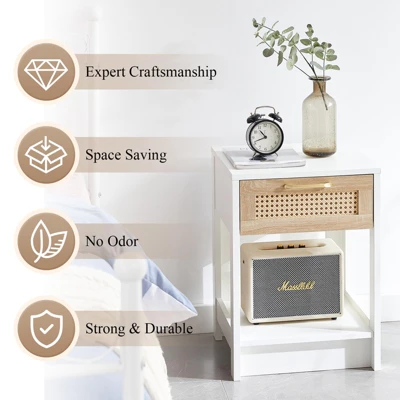 - Material: The main body is made of MDF, with rattan woven door panels and aluminum alloy handle.Item Dimensions:15.75 “L x 15.75 “W x 21.65 “H