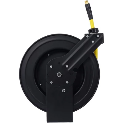 Description:Product name: Retractable Air Hose Reel, 1/2″x50′ Heavy Duty Steel Reel, Auto Rewind Air Hose Reel, Industrial Grade Rubber HoseColor: BlackMaterials: Steel– Flexible Guide Arm: Adjust the arm to three angles for mounting on the wall, ceiling, or floor. Constructed with sturdy metal for long-lasting strength, surpassing plastic alternatives in durability.– Stable Operation with Axle Support: Equipped with axle support, our air hose reel ensures stable performance with minimal wobbling or vibrations. Enjoy peace of mind with a secure and steadfast hose storage solution for reliable use.Packing list: 1 xRetractable Air Hose Reel, 1/2″x50′ Heavy Duty Steel Reel, Auto Rewind Air Hose Reel, Industrial Grade Rubber Hose